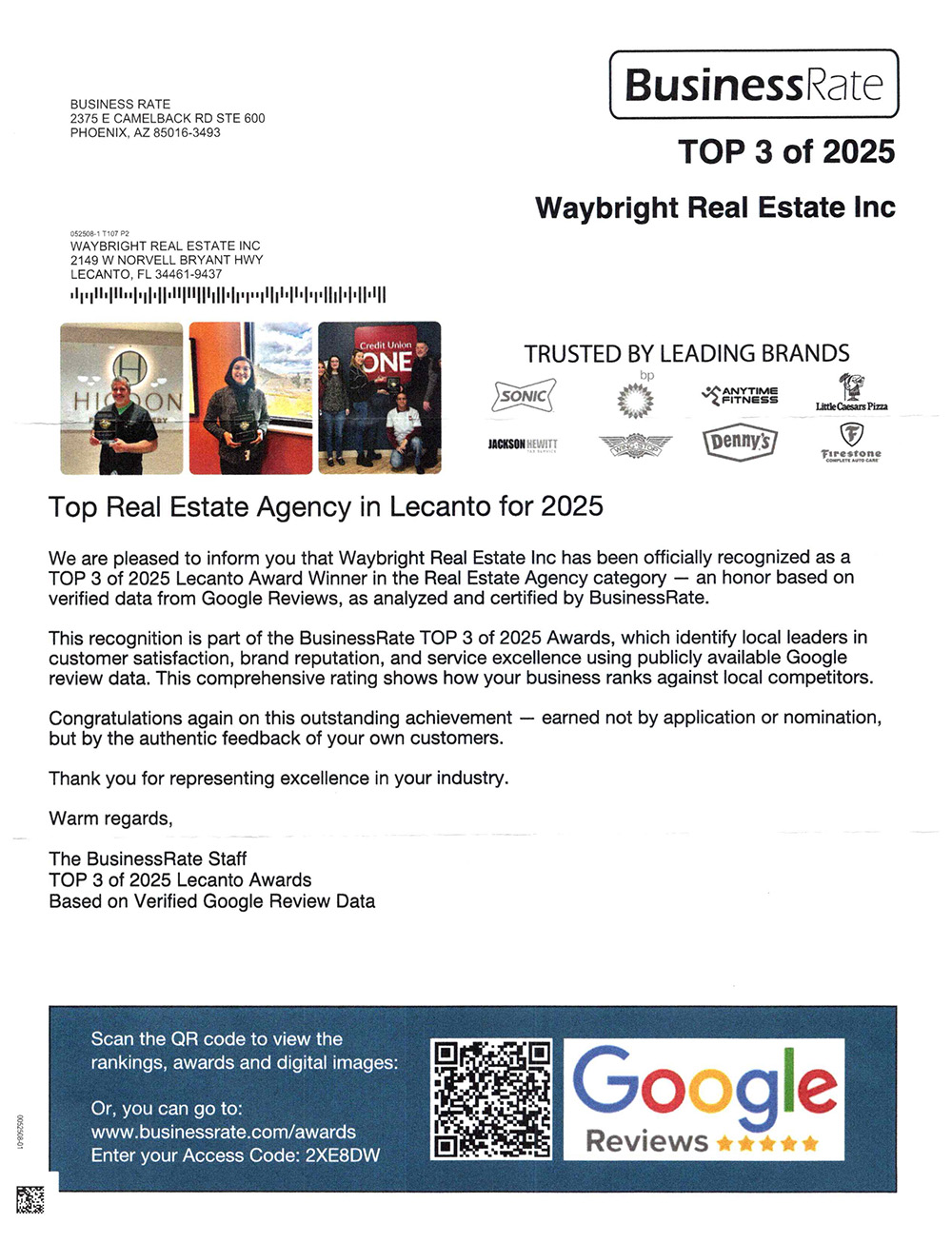 We are so thankful for the referral that directed us to Waybright Real Estate in Crystal River. Everyone at Way bright was professional and knowledgeable. Our long distance documents were handled properly in a timely manner and our closing processed right on schedule. I would recommend Stephanie Price and her Waybright team for any real estate needs, both long distance and local.